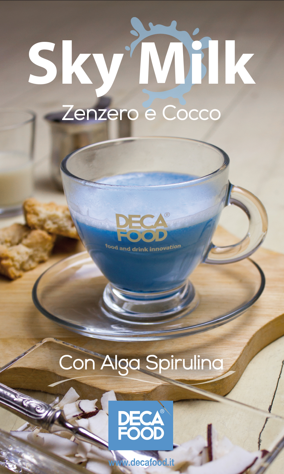Latte di cocco, zenzero, limone e alga spirulina, danno vita a una bevanda unica da erogatore, dolce ed esotica dal caratteristico colore del cielo dato dalla presenza dell’alga spirulina.